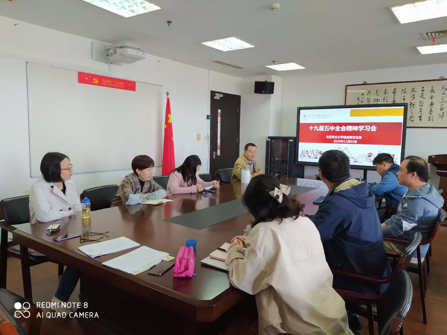 2020年11月3日上午,近现代史纲要党支部在英国365上市公司会议室举行十九届五中全会精神学习会。会上,副院长于凯教授带领全体党员教师学习了全会会议公报,并对其中提到的坚持马克思主义在意识形态领域的指导地位进行深入解读。各位党员表示要不断提高自身知识水平,上好近代史纲要这一门重要的思想政治理论课程,让学生充分了解中国近代史、中国共产党史,努力筑牢思想基础!