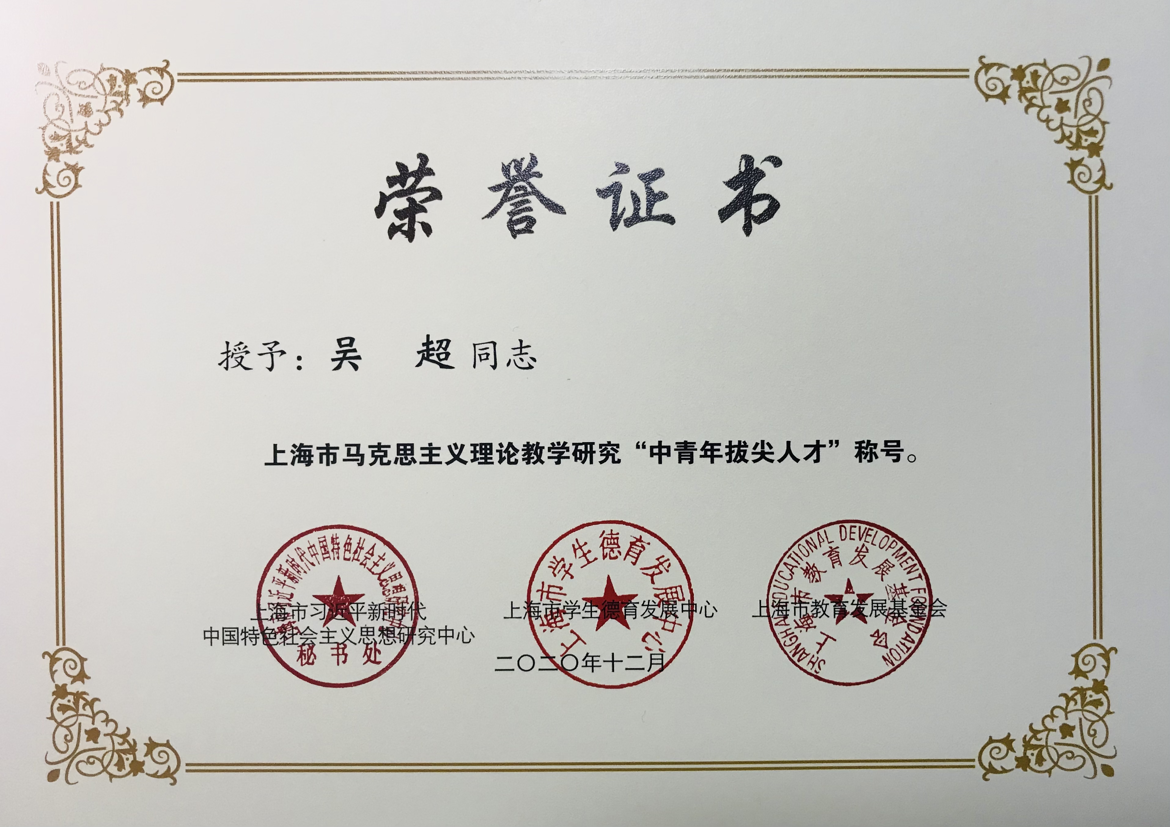 吴超副教授获得上海市马克思主义理论教学研究“中青年拔尖人才”称号
