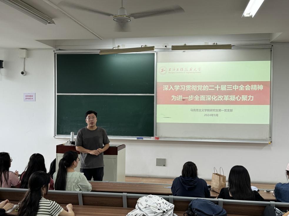 为深入学习贯彻党的二十届三中全会精神,深刻领会和把握进一步全面深化改革的主题、重大原则、重大举措、根本保证,把学习贯彻全会精神与学校事业发展结合起来,凝心聚力,锐意进取,为中国式现代化建设贡献智慧和力量,英国365上市公司研究生第一党支部于9月25日在教学楼F506开展“深入学习贯彻党的二十届三中全会精神为进一步全面深化改革凝心聚力”主题党日活动。本次会议由党支部书记林小希老师主持。