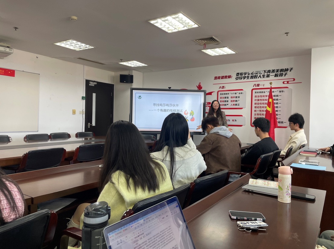 班会现场气氛热烈,同学们积极参与互动。郑老师先向同学们介绍了大学生常见的心理困扰,如环境适应问题、学习压力问题、人际关系困扰、情感挫折等,并提供了有效的应对策略。同学们也纷纷分享了自己在学习和生活中遇到的心理困惑,互相交流心得。接下来,郑老师带领同学们开展以自我认识为主题的心理团辅活动,“寻找呜莎伙伴”趣味性格测试、自我探索站等环节帮助大家更好地了解了自己的性格特征,增强了团队合作精神和沟通能力。