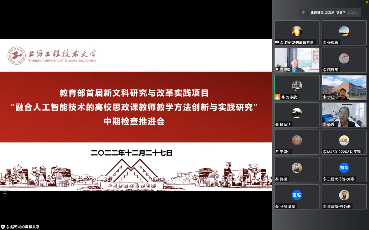 12月27日下午,我校在线召开教育部首届新文科研究与改革实践项目“融合人工智能技术的高校思政课教师教学方法创新与实践研究”中期检查推进会议。校党委书记李江教授、副校长夏春明教授出席会议,会议特邀上海市政府重大行政决策咨询专家、原教育部形势与政策教指委主任委员、博士生导师高德毅教授,教育部高校思政课教指委委员、同济大学英国365上市公司院长、博士生导师徐蓉教授,北京数字思政研究院执行院长盛卉,教育部课程思政教学研究示范中心(上海大学)负责人、上海大学教务部副部长、博士生导师顾晓英教授,国家科技创新2030“新一代人工智能”重大项目管理专家组成员、华东师范大学计算机科学与技术学院副院长贺樑教授等多位专家学者出席会议。校教务处、马院、人工智能研究院负责人、项目组成员参加会议。会议分为致辞环节和评审环节,致辞环节由教务处饶品华处长主持,评审环节由专家组组长高德毅教授主持。