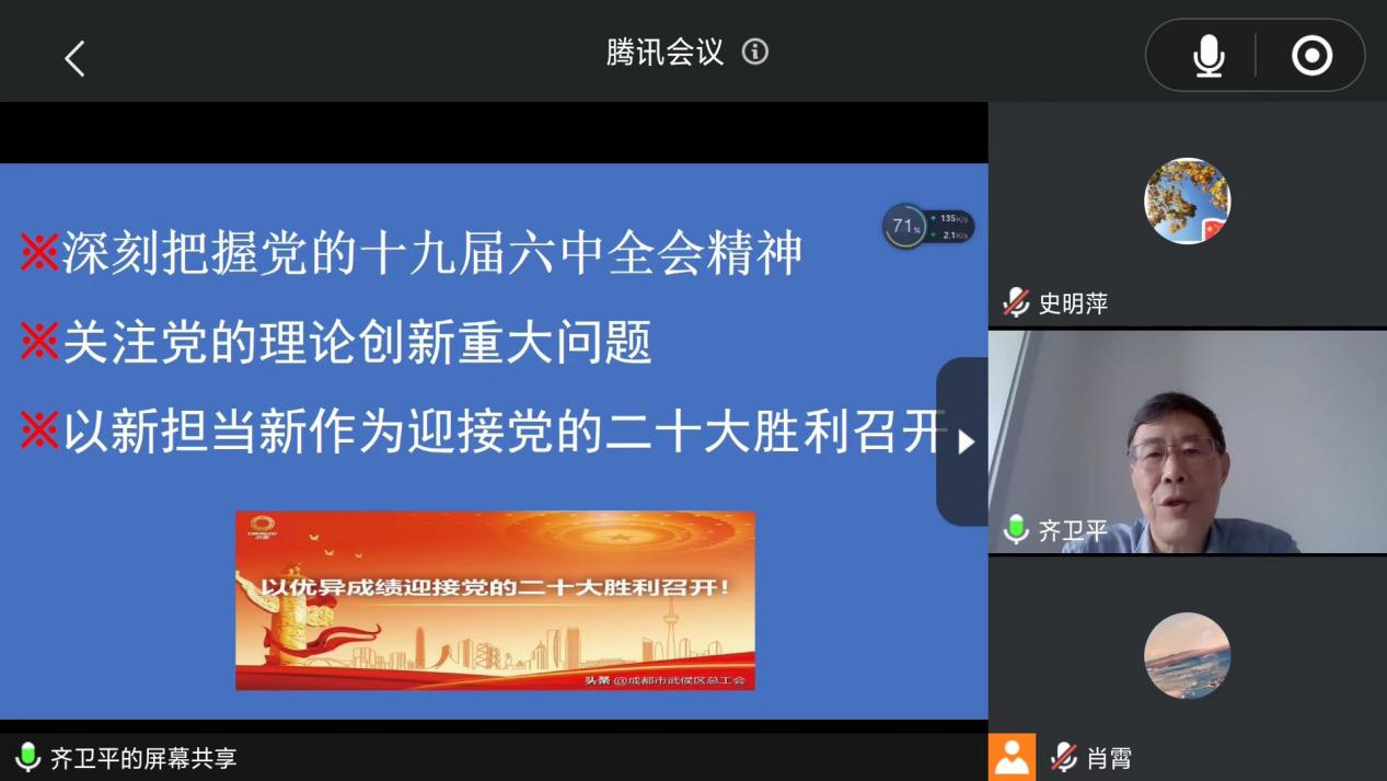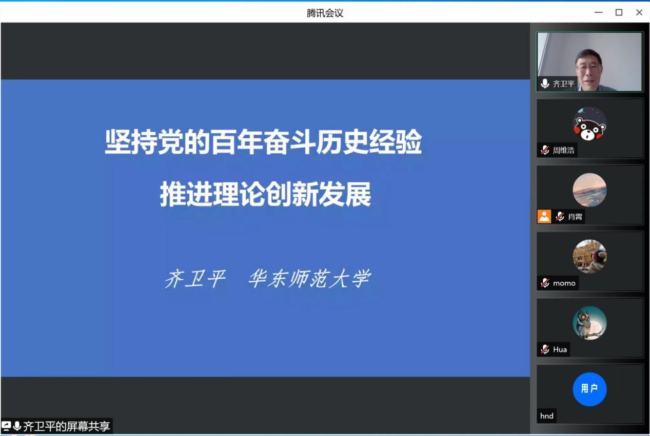 在深刻把握党的十九届六中全会精神的前提下,围绕《中共中央关于党的百年奋斗重大成就和历史经验的决议》这一重要文献与前两个历史决议的关系,以及这一历史决议的主要内容和历史意义,齐卫平教授结合自己对决议的深刻理解和具体研究,提出理论创新的重要观点,建议参会老师关注关于新时代新思想的新命名、坚定历史自信的重要思想、“五个必由之路”和“五个战略性有利条件”的重大论断等党的理论创新重大问题,为迎接党的“二十大”的胜利召开做好理论准备。最后,齐卫平教授以构建党的领导制度体系在高校如何落实为题,提出落实党的全面领导,推进高校党建工作创新,加快构建中国特色哲学社会科学,建设中共党史党建一级学科,推动党史学习教育常态化长效化等建议,勉励全体老师以新担当新作为迎接党的二十大胜利召开。