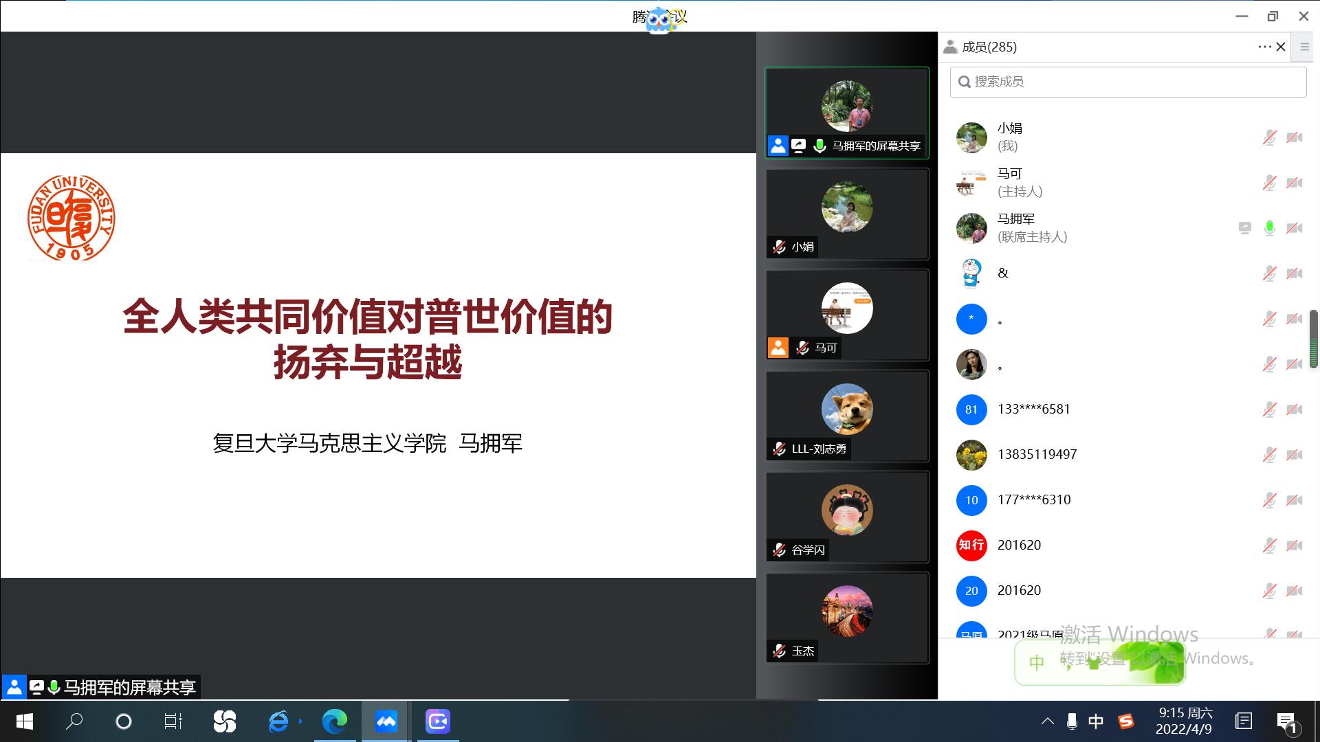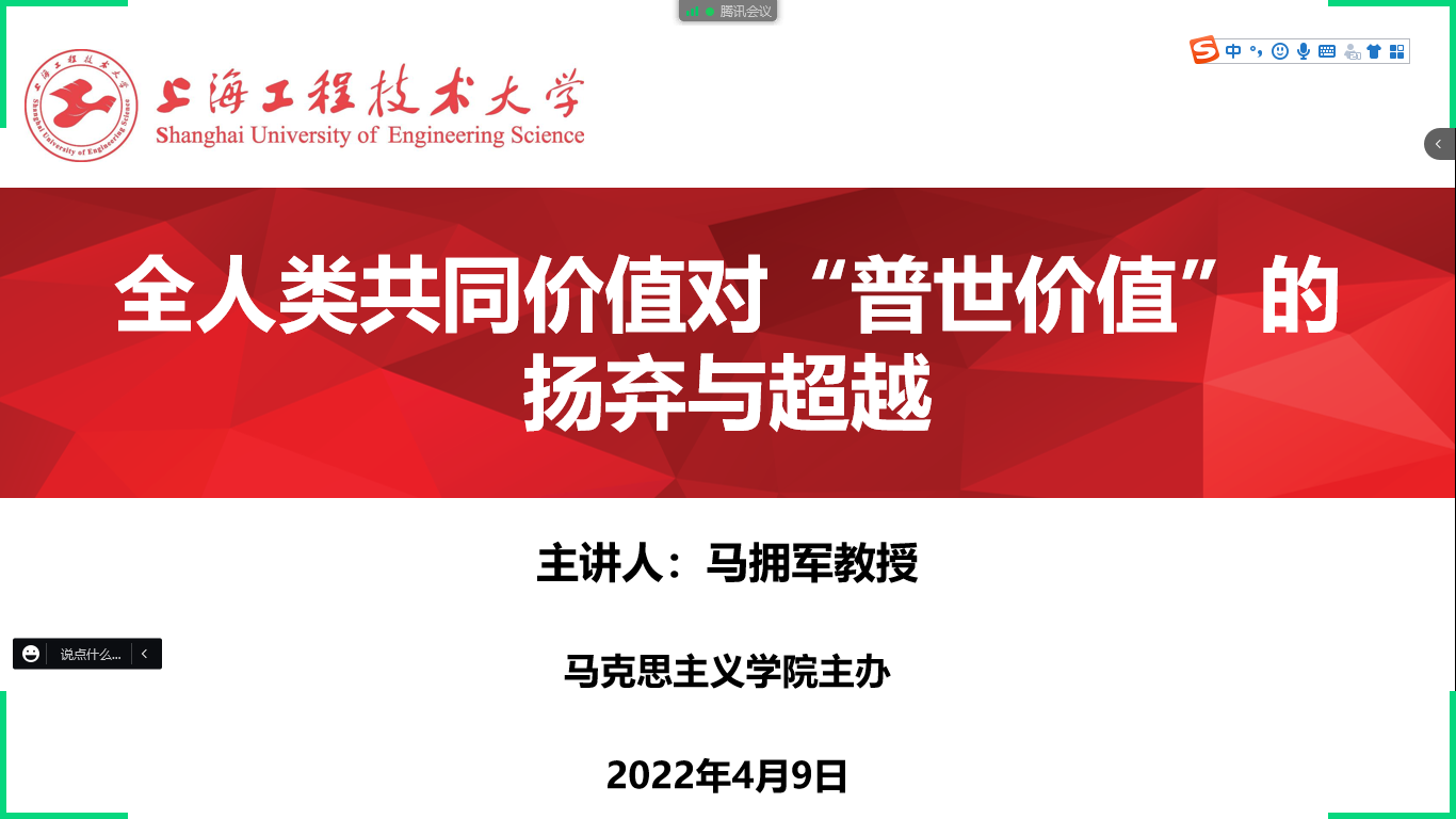 4月9日,英国365上市公司学术系列讲座“马克思主义学术周第1期”线上举办。此次讲座的主题为“全人类共同价值对‘普世价值’的扬弃与超越”,主讲人为马拥军教授。马拥军教授是复旦大学英国365上市公司教授、博士生导师,马克思主义基本原理学科带头人,国家社科基金通讯评议专家、国家社科基金重大项目首席专家,主要研究方向:马克思主义经典著作、马克思主义发展史。该讲座由工程大马院马可副教授主持,在腾讯会议线上举办。来自365上市公司、复旦大学、上海交通大学、南京大学、华中师范大学、安徽大学等高校的四百多位教师和学生聆听了该讲座。