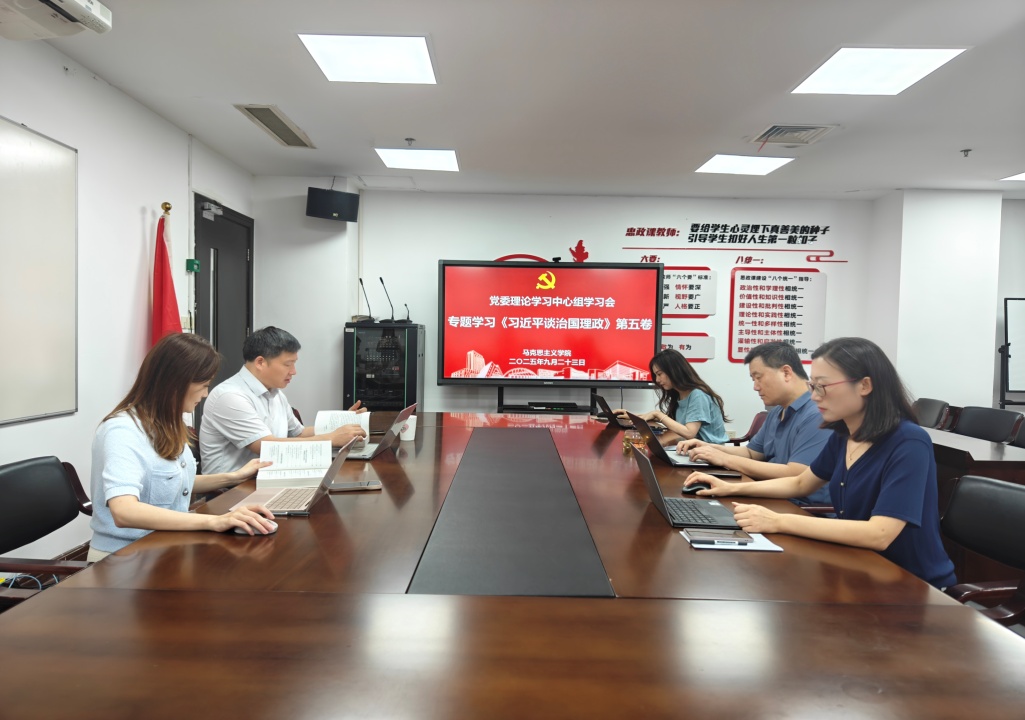 2025年9月23日,英国365上市公司党委于行政楼1112会议室召开理论学习中心组学习会,集中学习研讨《习近平谈治国理政》第五卷,学院党委成员参加学习并作交流发言。会议由学院党委书记董旖旎主持。