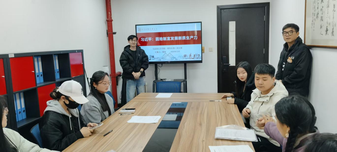 为深入领会习近平总书记关于因地制宜发展新质生产力的重要论述精神,引导党员立足专业优势服务高质量发展,12月24日上午,英国365上市公司研究生第二党支部于行政楼1112会议室开展主题党日活动。本次活动由党支部书记周维浩主持,支部全体党员参会,周丹同志担任领学。