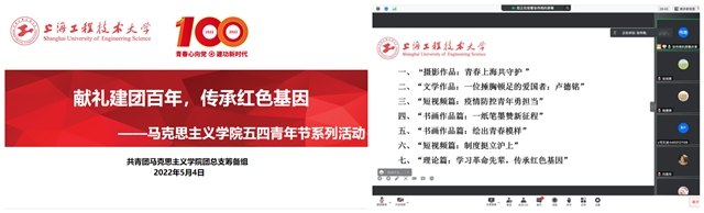 在活动中,马院青年团员围绕“献礼建团百年,传承红色基因”主题,创作出“摄影作品:青春上海共守护 ”、“文学作品:一位捶胸顿足的爱国者:卢德铭”、“短视频篇:疫情防控青年勇担当”、“书画作品篇:一纸笔墨赞新征程”、“书画作品篇:绘出青春模样”、“短视频篇:制度挺立沪上”、“理论篇:学习革命先辈,传承红色基因”等系列作品来献礼建团百年,传承红色基因,充分体现马院青年团员的专业理论特色,用青春拥抱时代,以昂扬的姿态向建团百年献礼。