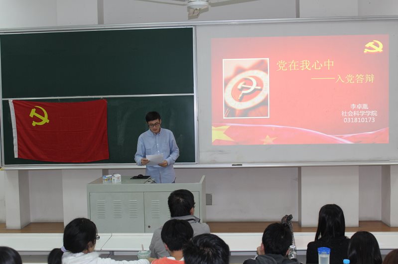 作为贯彻实施我校“三投票三公示两访谈两答辩”的制度,社会科学学院学生党支部于11月6日在E215举行入党积极分子公开答辩会。