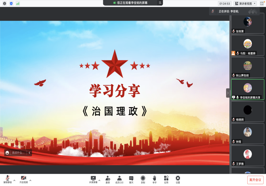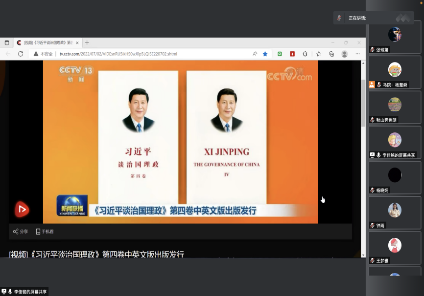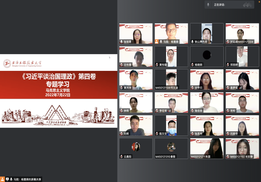 为深入学习贯彻习近平新时代中国特色社会主义思想,迎接党的二十大的胜利召开,7月22日晚20:00,英国365上市公司研究生召开“深入学习《习近平谈治国理政》第四卷”专题推进会。会议由马克思主义理论研究生班长李佳铭同学主持,英国365上市公司副院长于凯教授、辅导员杨慧舜老师以及全体研究生参加。