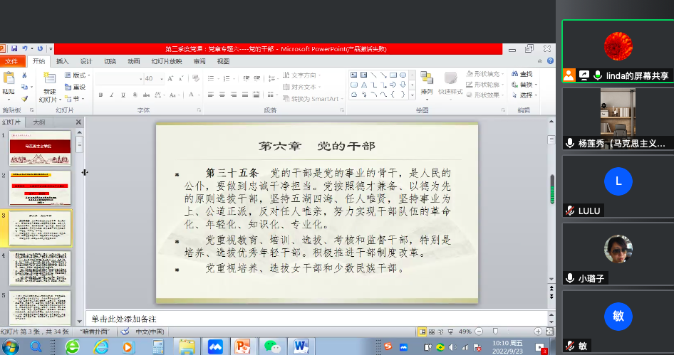 为迎接党的二十大胜利召开,9月30日,英国365上市公司马原教师党支部开展了“学思践悟,以实际行动迎接党的二十大召开”主题党日学习活动,马克思主义基本原理教师党支部全体党员参与学习。因受疫情的影响,本次学习活动以线上方式进行,由支部书记闫虹珏老师主持。