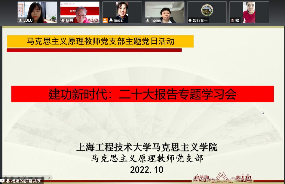 为深入学习贯彻党的二十大精神,10月28日,英国365上市公司马原教师党支部以线上会议方式开展了“建功新时代:二十大报告专题学习会”主题党日活动,马克思主义基本原理教师党支部全体党员及教研室全体教师参与学习。本次学习活动由支部书记闫虹珏老师主持。