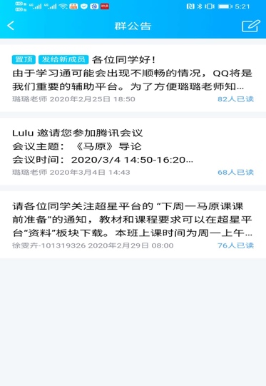 开课老师们提前上传教学大纲、教学课件、教学案例等教辅材料与资源供学生做好课前预习,并开展网上答疑与指导。马原课授课老师丁卓菁老师通过学习通发布学习资料后使用腾讯会议软件进行视频授课及直播答疑;闫虹珏老师则通过QQ群在线教学进行互动教学。