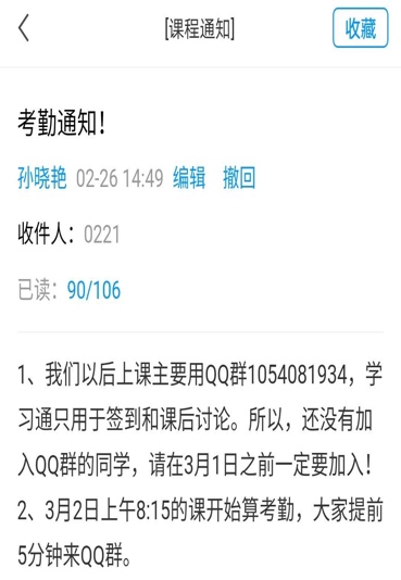 探讨网络授课过程中可能存在的各类问题,如平台使用熟练程度、在线学生管理、网络平台实施存在的弊端提出备选方案等。开课老师会在学习通发布相关在线教学备选方案通知,遇到问题能够及时转化授课模式。