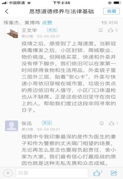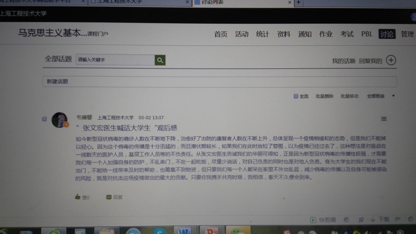 为充分发挥思政课对学生的思想引领作用,开课老师们围绕“疫情防控”主题,上好在线教学第一堂思政课。将防疫抗疫中涌现的先进人物、典型事迹作为教学案例融入思政课教学,不断增强思政课线上教学效果,坚定师生打赢疫情防控战的信心。
