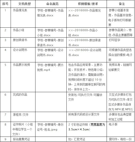 参赛作品必须为原创作品,作品提交内容包括作品情况表、原创承诺书、设计说明书、作品展示视频、系统安装包/可执行文件/可播放文件、源程序代码(源文件)、电子版的参赛成员(每位)两寸彩色证件照片。相关模板可从竞赛网站上下载,提交的文档应按规范命名,具体要求见下表,网上报名时将产生参赛编号,用于相关文档的制作。